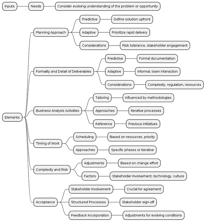 Business Analysis Approach: This document outlines the strategy for conducting business analysis, specifying what needs to be analyzed, who will be involved, when it will be done, and how it will be executed. It serves as a roadmap for integrating other outputs while also being able to stand alone as a comprehensive plan.